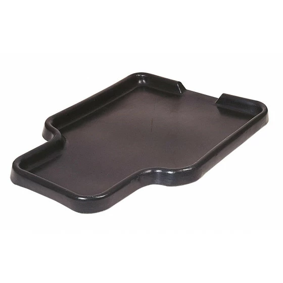 Epaisseur intermédiaire. Polyéthylène. Avec décrochement pour passage des roues de la bétonnière et encoche pour passage des roues de la brouette. 1,5 m x 2 m. Profondeur du bac : 1 cm.