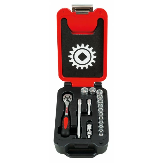 Coffret 1/4″. CLIQUET poire : levier de changement de sens intégré dans la tête = pas de risque d’inversion accidentelle. Déverrouillage des douilles par bouton poussoir. Changement de sens par le pouce. Le sens est donné par la position du levier. Faible encombrement de la tête allongée. DOUILLES : La suppression des angles vifs des carrés augmente leur résistance et protège les écrous contre le matage. La manipulation des douilles est rendue facile grâce à un épaulement extérieur prévu pour la prise. Marquage de la dimension sur tout le pourtour. COFFRET : en Polyéthylène Haute Densité (PEHD), ne s’abîment pas aux chocs comme des coffrets métalliques, qu’il est nécessaire de débosseler. Fermoirs métalliques. Mousse bicolore pour un repérage facile des manquants. Mousse haute densité, à cellule fermée, qui ne prend pas l’humidité. Les outils sont calés en douceur. Dimensions : 135x215x6 mm. Compatible Fusion Box : peut se glisser sur un coffret plus grand. 12 douilles 6 pans : 4/5/5,5/6/7/8/9/1/11/12/13/14 mm // 1 cliquet poire // 1 cardan // 2 rallonges : 5 et 125 mm