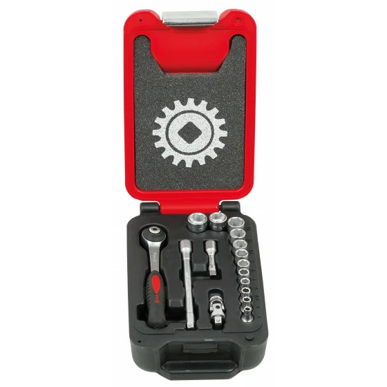 Coffret 1/4″. CLIQUET PREMIUM : Verrouillage et déverrouillage rapides des douilles par bouton poussoir. Les douilles ou les accessoires ne se désolidarisent pas du cliquet. L’angle de rotation de 5° (cliquet à 72 dents) assure une reprise très performante dans des espaces réduits. Les têtes des cliquets ont un encombrement réduit pour offrir l’accessibilité maximale. Tête ronde : le changement du sens de serrage se réalise facilement avec le pouce sur toute la circonférence de la tête. Manche confortable bimatière étudié pour travailler dans toutes les positions : polypropylène pour plus de résistance, élastomère pour une bonne prise en main (grip). Liaison corps-manche du cliquet étudiée pour ne pas gêner la main lors de la prise. DOUILLES : La suppression des angles vifs des carrés augmente leur résistance et protège les écrous contre le matage. La manipulation des douilles est rendue facile grâce à un épaulement extérieur prévu pour la prise. Marquage de la dimension sur tout le pourtour. Douilles 6 pans pour serrages puissants. COFFRET : en Polyéthylène Haute Densité (PEHD), ne s’abîment pas aux chocs comme des coffrets métalliques, qu’il est nécessaire de débosseler. Fermoirs métalliques. Mousse bicolore pour un repérage facile des manquants. Mousse haute densité, à cellule fermée, qui ne prend pas l’humidité. Les outils sont calés en douceur. Dimensions : 135x215x6 mm
