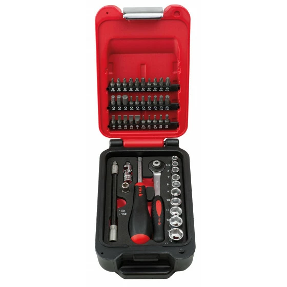 Coffret complet 1/4″ et vissage : cliquet Premium 72 dents, 1 douilles, une poignée tournevis, 3 embouts de vissage, rallonges dont une flexible exclusive. CLIQUET PREMIUM : Verrouillage et déverrouillage rapides des douilles par bouton poussoir. Les douilles ou les accessoires ne se désolidarisent pas du cliquet. L’angle de rotation de 5° (cliquet à 72 dents) assure une reprise très performante dans des espaces réduits. Les têtes des cliquets ont un encombrement réduit pour offrir l’accessibilité maximale. Tête ronde : le changement du sens de serrage se réalise facilement avec le pouce sur toute la circonférence de la tête. Manche confortable bimatière étudié pour travailler dans toutes les positions : polypropylène pour plus de résistance, élastomère pour une bonne prise en main (grip). Liaison corps-manche du cliquet étudiée pour ne pas gêner la main lors de la prise. DOUILLES : La suppression des angles vifs des carrés augmente leur résistance et protège les écrous contre le matage. La manipulation des douilles est rendue facile grâce à un épaulement extérieur prévu pour la prise. Marquage de la dimension sur tout le pourtour. Douilles 6 pans pour serrages puissants. COFFRET : en Polyéthylène Haute Densité (PEHD), ne s’abîment pas aux chocs comme des coffrets métalliques, qu’il est nécessaire de débosseler. Fermoirs métalliques. Mousse bicolore pour un repérage facile des manquants. Dimensions : 135x215x6 mm.