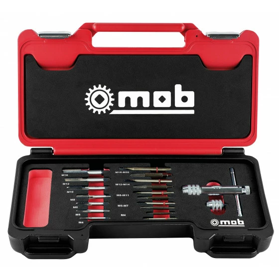1 porte-outils à cliquet // 1 tête amovible // 5 forets coniques // 5 extracteurs : N°1: M4/ N°2 : M6 à M8/ N°3 : M8 à M1/ N°4 : M12 à M14 // N°5 : M14 à M2 // 7 tarauds : M4-M5-M6-M8-M1-M12-M16. COFFRET : en Polyéthylène Haute Densité (PEHD), ne s’abîment pas aux chocs contrairement aux coffrets métalliques, qu’il est nécessaire de débosseler. Fermoirs métalliques. Mousse bicolore pour un repérage facile des manquants. Mousse haute densité, à cellule fermée, qui ne prend pas l’humidité. Les outils sont calés en douceur. Dimensions : 45x225x6 mm. Compatible Fusion Box : peut se glisser sur un plus grand coffret d’outillage.