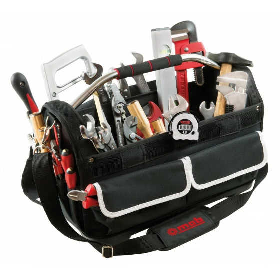 Boite à outils textile. Multiples poches intérieures et latérales. Nouvelles poches intérieures élastiques pour un rangement facilité. Poignée mousse confortable. Bandoulière réglable avec fourreau antidérapant. Base en polypropylène à patins 1,7 cm. Poignée : barre métal surmoulée. Toile 6 Deniers résistante à l’usure et aux accros. Rabat de protection. Côtés renforcés. Fond étanche grâce à sa base en polyéthylène de 4,7 cm. Volume : 22 L. Dimensions extérieures : L51xl26xH37 cm – intérieures : L44xl2.5xH24 cm. Composition : 12 clés à fourche : 6×7-8×9-1×11-12×13-14×15-16×17-18×19-21×23-22×24-26×28-27×29-3×32 mm // 1 clé à molette 25 mm // 1 clé à crémaillère 28 mm // 2 tournevis d’électricien : 3.5×75 – 4×1 mm // 5 tournevis à frapper : 3 fentes : 5,5×1-7×125-9×15 mm / 2 Pozidriv : PZ1 – PZ2 // Etui de 9 clés mâles : 1.5-2-2.5-3-4-5-6-8-1 mm // 1 pince coupante diagonale de 16 mm // 1 pince multiprise superposée de 24 mm // 1 pince étaux becs longs 25 mm // 1 scie à métaux poignée aluminium // 1 lames de scies à métaux: 5 HSS + 5 HCS // 1 mesure 3 m // 1 niveau rectangulaire de 4 cm // 1 clé Stillson 18’’/2 // 1 clé à chaîne de 3 mm // 1 coupe tube cuivre // 1 coupe tube PVC // 1 appareil à battre les collets // 1 marteau à garnir de 3 mm hickory // 1 lime mi-ronde mi-douce de 2 mm.