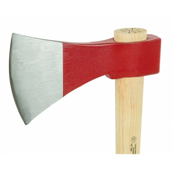 Acier à forte teneur en Carbone C45. Trempe des parties travaillantes sur 2mm: dureté de 45-5HrC minimum. Dureté autour de l’œil : 35 HrC maximum. Peinture satinée au trempé rouge. Hache dégagée vernie. Taillant protégé par un caoutchouc. Manche frêne.