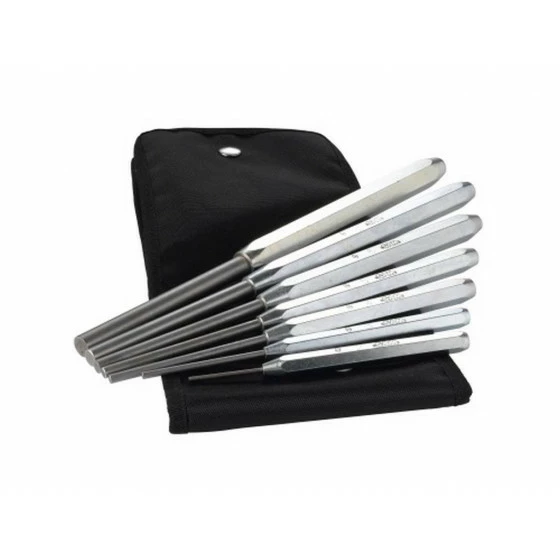 Trousse de 7 chasse-goupilles longs à lame rapportée en acier chrome-vanadium.