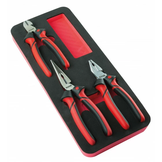 1 universelle 18 mm // 1 coupante diagonale 16 mm // 1 becs demi-ronds 2 mm. Dans module mousse bicolore 385 x 165 mm. Chaque outil a une place définie. Les outils manquants se repèrent en quelques secondes grâce au fond rouge. Mousse bi-colore haute densité, ne casse pas, ne retient pas l’humidité et résiste aux produits de l’atelier.