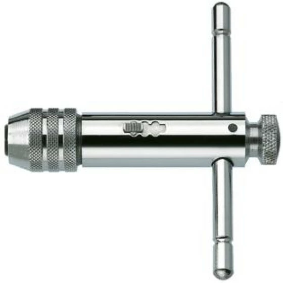 Pratique pour tarauder dans les endroits difficiles d’accès à la place d’un tourne-à-gauche classique. Sert également pour les extracteurs de vis ou goujons cassés ou même des embouts grâce à son mandrin novateur pour le serrage combiné carré et hexagonal. 1/4. 3 positions de cliquet : serrage, desserrage, fixe. Broche amovible, s’utilise en T ou en L. Chromé, tout en acier. Capacité : 4,6-8 M5-12 ISO M6-12 11 mm.