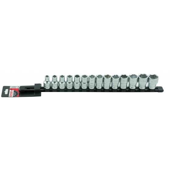 Douilles en acier Chrome-Vanadium, le meilleur matériau pour la fabrication de douilles et accessoires. La suppression des angles vifs des carrés augmente leur résistance. Rack plastique brochable et vissable. Supports individuels de douilles amovibles. 8-1-11-12-13-14-15-16-17-18-19-21-22-24 mm