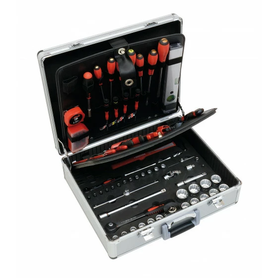 Coins renforcés et arrondis. Ouverture/fermeture par charnières et articulations. PRATIQUE: 2 panneaux de rangement (non amovible): 3 faces avec élastiques pour ranger tous types d’outils (clés, pinces, mesures…). Soute compartimentable (séparateur fournis). Transport facilité: poignée bimatière. Fermeture avec clé. Composition : 11 clés mixtes : 6-8-9-1-11-12-13-14-17-19-22 mm // 1 clé à molette 2 mm // 7 tournevis bimatière: 5 fentes : 3.5×75 – 4×1 – 5,5×1 – 6,5×15 – 8×15 mm / 2 Phillips : PH1 – PH2 // 4 micro tournevis : 2 fentes :2-3 mm / 2 Phillips : PH – PH // 1 jeu de 9 clés mâles: 1,5-2-2,5-3-4-5-6-8-1mm // 1 pince universelle de 18 mm // 1 pince multiprise 24 mm // 1 cisaille coupe tout droite 19 mm // 1 cutter 18 mm // 1 mini scie // 5 lames de scies HSS // 1 mesure 2 m // 1 réglet de 15 mm // 1 niveau rectangulaire de 3 mm // 1 marteau rivoir 3 mm trimatière // 1 pointeau 6 mm // 2 chasse-goupilles 4 – 5 mm // 1 chasse-pointes de 4 mm // ¼’’ : 1 cliquet 72 dents // 12 douilles 6 pans : 4-5-5,5-6-7-8-9-1-11-12-13-14 mm // 1 douille 12 pans de 3,2 mm // 1 cardan // 1 poignée coulissante 115 mm // 2 rallonges : 5 – 125 mm // 1 poignée tournevis porte-embouts // 1 douille porte- embouts 6 pans // 1 embout porte douilles // 1 boite de 3 embouts + porte-embouts // ½ ‘’ : 1 cliquet 72 dents // 17 douille 12 pans : 1-11-12-13-14-15-16-17-18-19-2-21-22-24-27-3-32 mm // 1 cardan // 1 poignée coulissante 255 mm // 2 rallonges : 125 – 25 mm // 1 adaptateur 1/2=>3/8 .